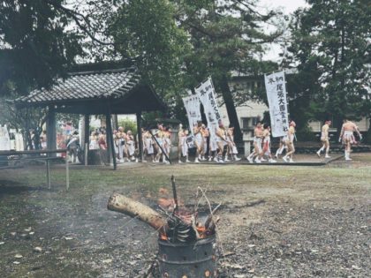 近くの神社で焚き火と日本酒を準備して待っていたら裸男たちがやってきた。