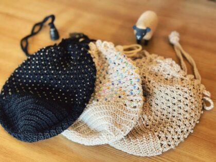 と母へ言ったら、じーっと見てた。数日後、母が編んでくれたポーチ3つが郵送されてくる。