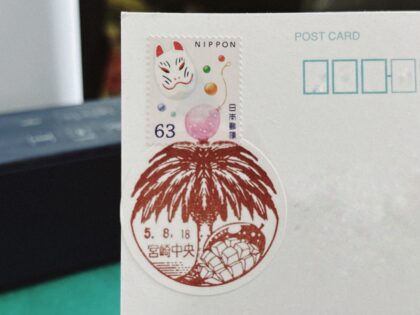 県木であるフェニックス、「太陽のタマゴ」として全国販売されているマンゴー、そして背景には「鬼の洗濯板」と称される海岸の風景といった、宮崎をあらわすシンボリックな題材を据え、地域の特色を表現している。