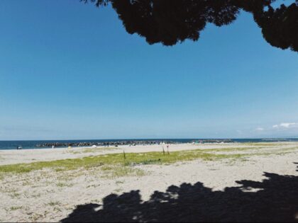 墓参りを終えて、義母と帰省中の義姉と3人で電車に乗って海まで。日陰でぼんやり。