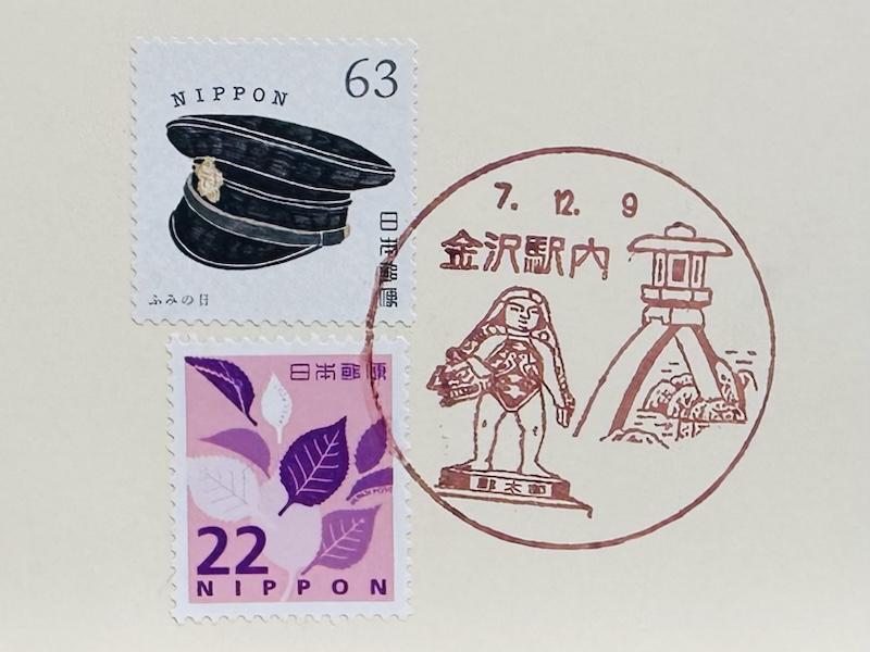 兼六園の「徽軫(コトジ)灯籠」を描き、金沢駅構内に設置の郵太郎ポストを配す