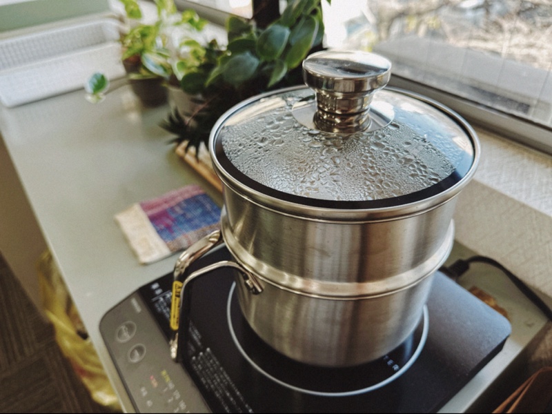 事務所での昼ご飯に、卓上クッキングヒーターと小さな片手鍋を使い、家から切って持ってきた野菜とアルトバイエルンを蒸して塩とオリーブオイルをかけて食べている。同僚から「事務所でやりたい放題だね」と言われながら。